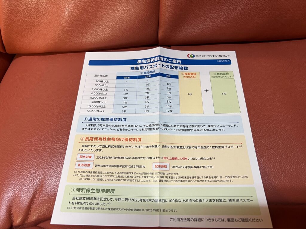 株主用パスポートの配布枚数は以下の通りです。(2025.12株主優待送付資料より抜粋)